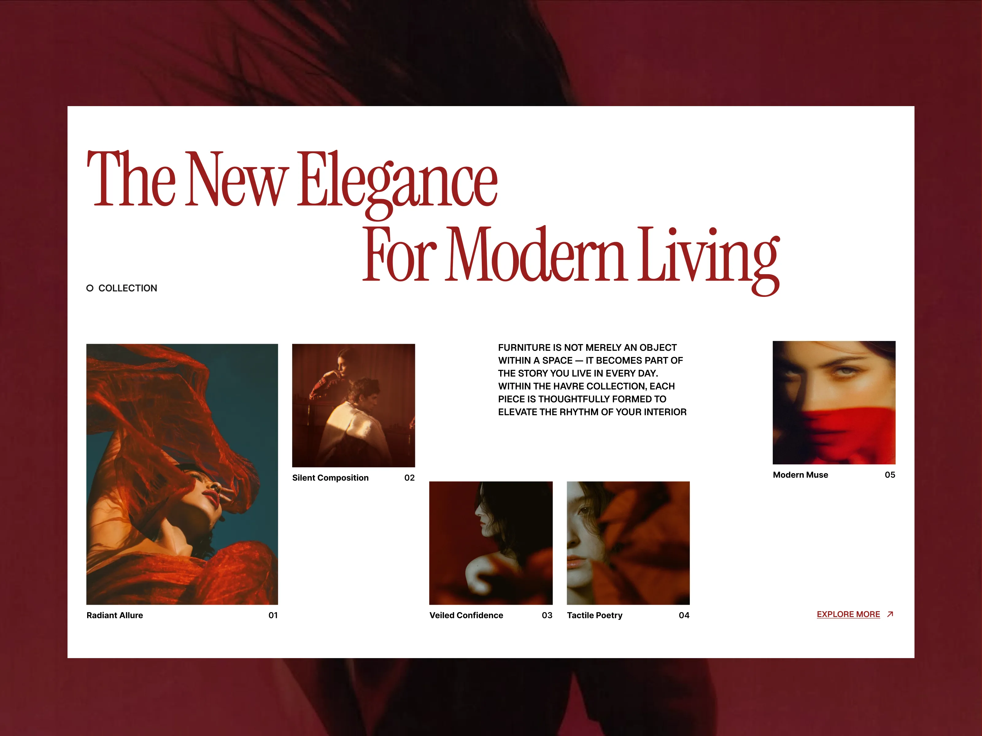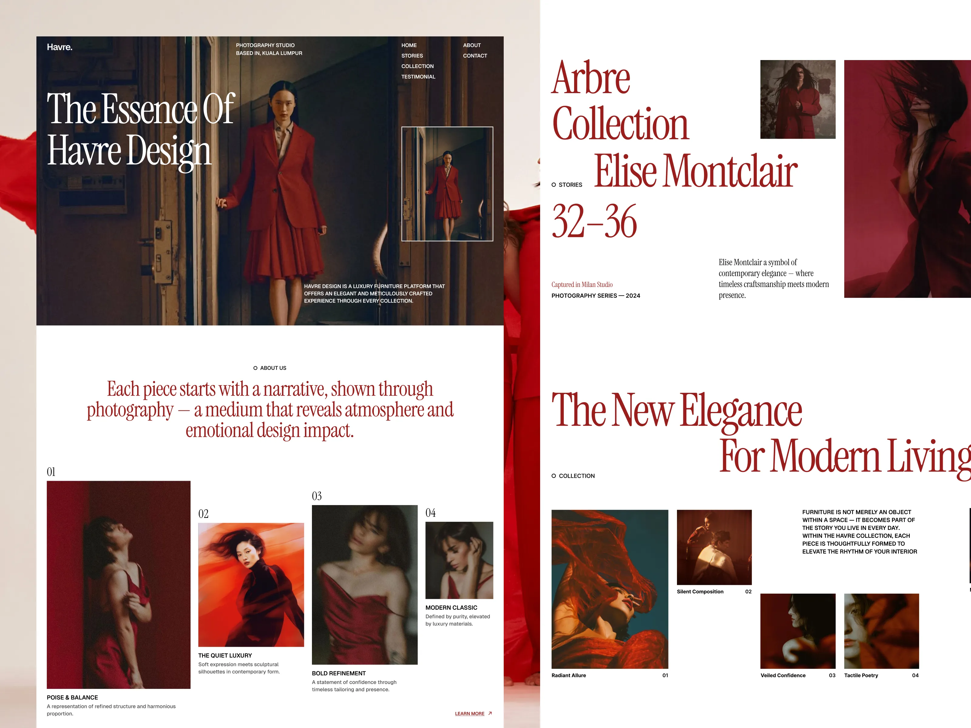 An editorial website exploration for a luxury design brand, focusing on storytelling through photography, typography, and refined composition.