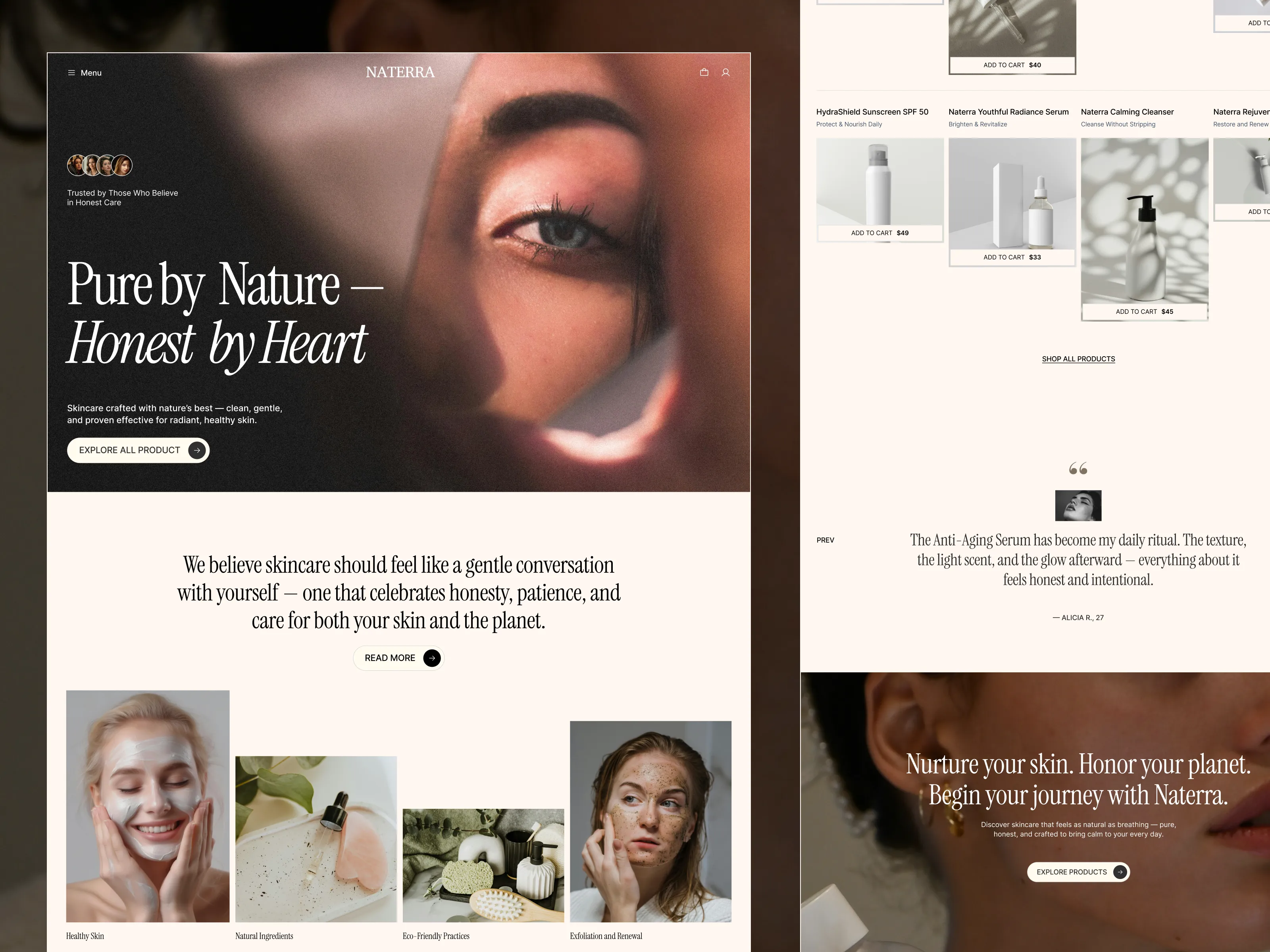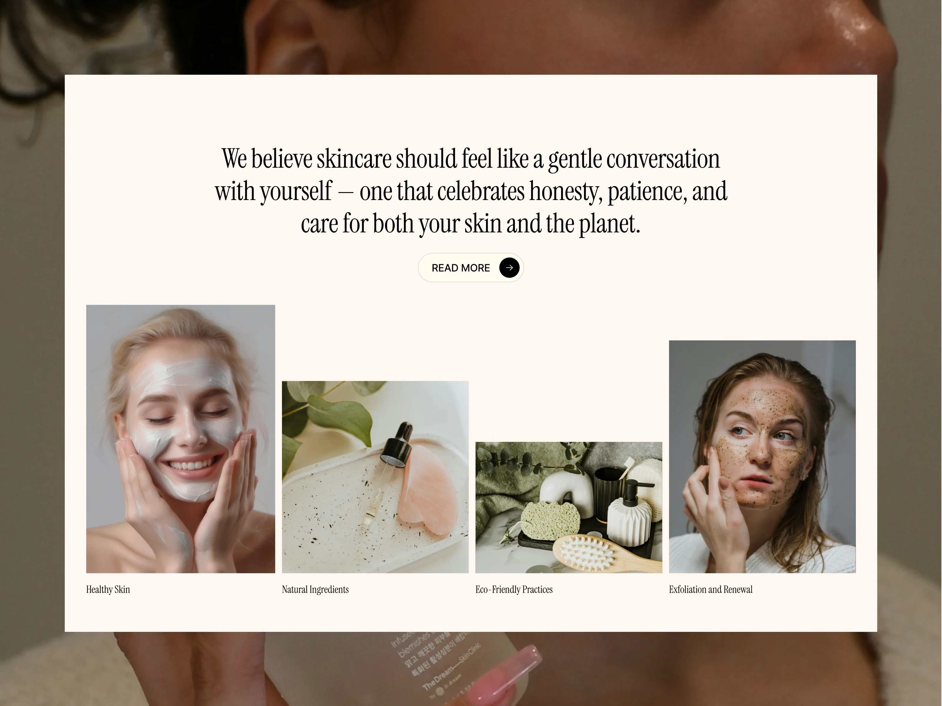 A clean and modern landing page concept that focused on soft visuals, elegant typography, and a calm shopping experience that highlights ingredients and products clearly.